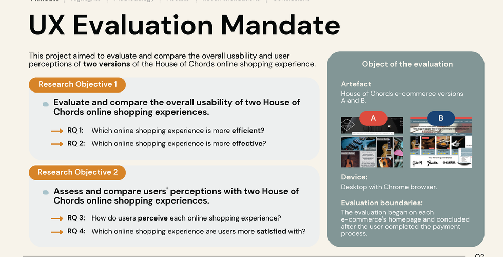 The main goal of this UX evaluation was to generate actionable insights that could help House of Chords improve its digital experience and increase online sales. The study aimed to identify which version of the website delivered a better online shopping experience, focusing on key UX metrics such as efficiency, effectiveness, user satisfaction, and user perception.